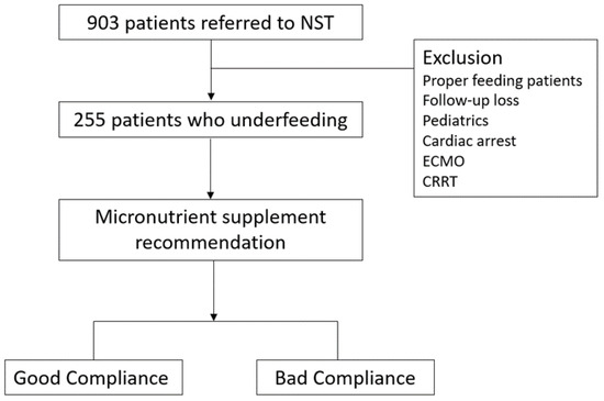 Flow of micronutrient supplement plan. NST, nutritional support team; ECMO, extracorporeal membrane oxygenation; CRRT, continuous renal replacement therapy.