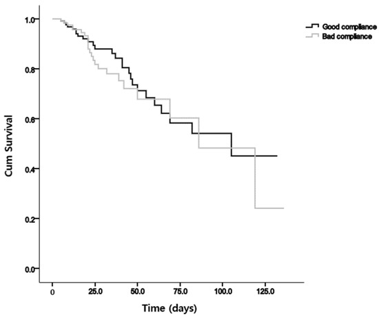 Plots of Kaplan–Meier survival between good compliance and bad compliance group (p = 0.536).