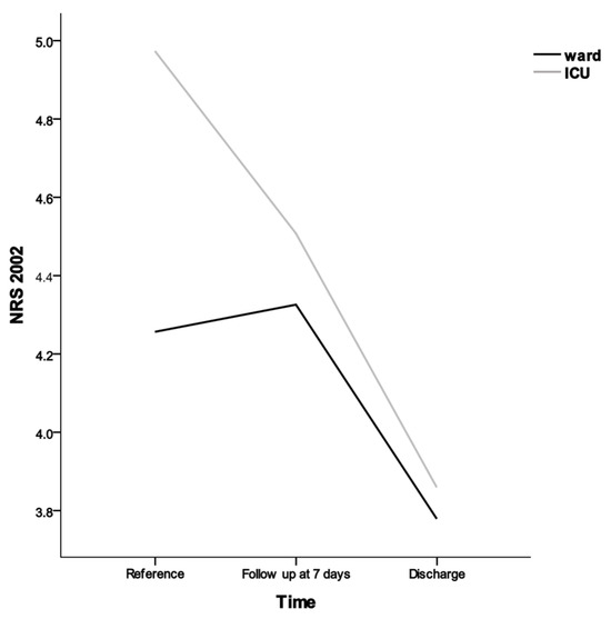 Differences in the effectiveness of nutritional interventions between ICU and ward. NRS 2002, Nutrition Risk Screening 2002; ICU, the intensive care unit. ICU patients (n = 71), ward patients (n = 86).