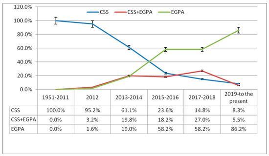 A total of 1595 publications were reviewed in the PubMed database from 1951 to the present, and 1089 (68.3) of the articles included CSS, 410 (25.7%) of the articles included EGPA, and 96 (6.0%) of all the publications included both. While 99.7% of all the articles included in the study between 1951 and 2012 included the nomenclature as CSS, this rate decreased to 22.4% since 2013. Since 2013, EGPA has been used in 63.1% of all the articles, while CSS and EGPA have been used together in 14.5%. The nomenclature for CSS was used in sixty (95.2%) of all the articles included in the study in 2012, EGPA in one (1.6%), and CSS and EGPA in two (3.2%) articles. When evaluated in terms of the distribution according to years, it was determined that there was a statistically significant increase in use in terms of EGPA, while there was a significant decrease in CSS. Also, the rate of combination use of CSS and EGPA decreased (Table 1) (Figure 1).