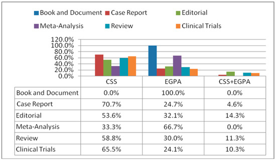 When evaluating all the articles, there were twelve-hundred-seventy-seven (80.1) case reports, two-hundred-fifty-seven (16.1%) reviews/case-based reviews, twenty-nine (1.8%) clinical trials, twenty-eight (1.8%) editorials, three (0.2%) meta-analyses, and only one (0.1%) book. Among these groups, the case reports and reviews/case-based reviews were significantly higher than the others. The distribution of the eponyms CSS, EGPA, and both of these by the article type is shown in Figure 2.