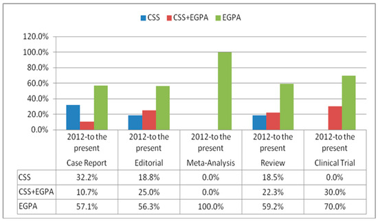 A total of 410 (57.7%) articles were found in searches that included EGPA in their title since 2012. Until 2012, seven-hundred-twenty-five (82%) case reports, one-hundred-twenty-seven (14.4%) reviews, nineteen (2.1%) clinical trials, and twelve (1.4%) editorials were published with the eponym of CSS. When evaluated from 2012 to the present, it was determined that the amount of case reports, editorials, meta-analyses, reviews, and clinical studies in which EGPA was used in the article title was numerically higher than CSS and CSS+EGPA. The distribution of the eponyms according to the article style from 2012 to the present is shown in Figure 3.