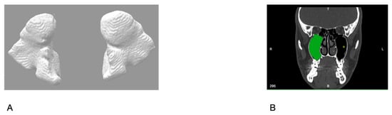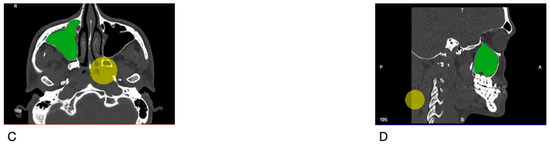 DICOM files were imported into the INVESALIUS software, v3.1 (Renato Archer Information Technology Center, Campinas, Brazil). All the slices were analyzed and processed by a two-person team (P.G. and P.R.) and double-checked. The MS were manually marked. The anatomical landmarks were bone walls with virtual continuity in the narrowest point of the maxillary sinus infundibulum. Finally, three-dimensional models of the MS were acquired, and the volumes were calculated using the BLENDER® software, v4.0 (Blender Foundation, Amsterdam, Netherlands) (Figure 1A–D).