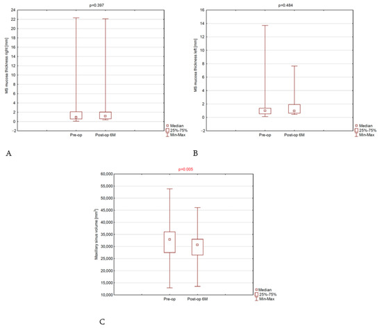 The median thickness of the MS mucosal membrane on the right side increased (0.9 mm to 1.2 mm), but the change was not statistically significant; moreover, in the case of the MS mucosal membrane on the left side, the median thickness did not change (Table 2 and Table S1, Figure 2A,B).
