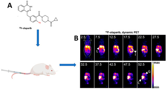 [18F]F-20 is one of the tracers that has been effectively synthesized with good radiochemical yield [63]. Although it has shown some specific PARP binding to glioblastoma and good tumor retention properties, which allowed for preclinical PET visualization of PARP overexpressing tumors, it has associated drawbacks. These include rapid hepatobiliary clearance and in vivo defluorination followed by non-specific [18F]F bone tissue uptake in mice [63].