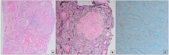 - Vargas, F.; Gedalia, A.; Craver, R.D.; Vehaskari, V.M. Recurrence of Granulomatous Interstitial Nephritis in Transplanted Kidney. Pediatr. Transplant. 2010, 14, e54–e57. [Google Scholar] [CrossRef] [PubMed]