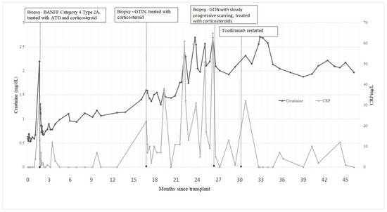 Renal function (serum creatinine) and CRP post-transplantation. Annotations illustrate the timing of the three allograft biopsies, with histological diagnoses, and the point at which anti-IL-6 treatment was re-started. (Conversion factor serum creatinine in mg/dL to μmol/L, ×88.4).