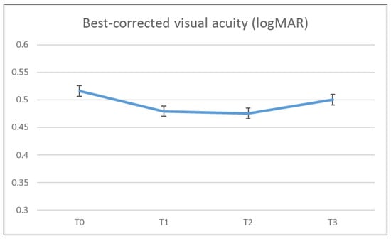 The mean BCVA did not significantly change from the baseline at the various follow-up time points (0.52 ± 0.12, 0.48 ± 0.27, 0.48 ± 0.28, and 0.50 ± 0.27 logMAR in T0, T1, T2, and T3, respectively). Vision remained stable even after additional brolucizumab treatment. Figure 1 shows the graphical representation of the changes in BCVA.