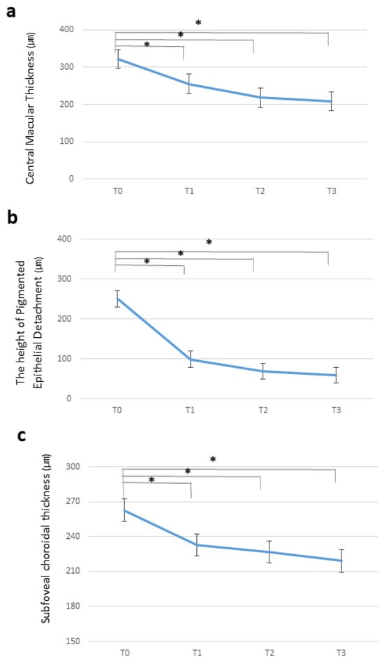 Before brolucizumab treatment, the mean SFCT was 262.8 ± 79.7 μm, which decreased to 233.0 ± 71.2 μm (p = 0.001) after the first injection. Additional brolucizumab injections led to a further reduction in SFCT compared to the baseline, with values of 226.9 ± 68.4 and 219.1 ± 64.5 μm at T2 and T3, respectively (p = 0.012). Temporal changes in SFCT are shown in Figure 2c.