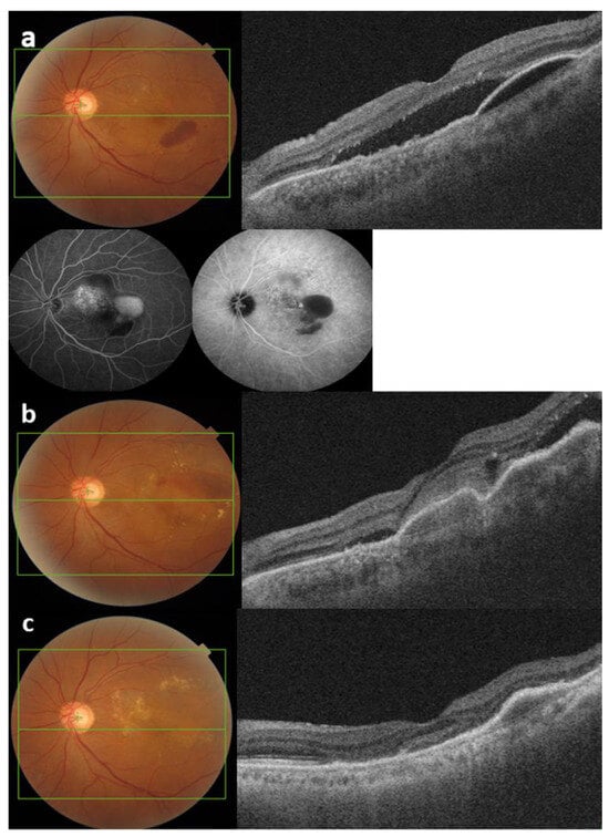 A 69-year-old male patient was initially diagnosed with type 1 macular neovascularization in the left eye. He had a best-corrected visual acuity (BCVA) of 0.49 logMAR. (a) Color fundus photograph and swept-source optical coherence tomography (SS-OCT) showed large pigment epithelial detachment with subretinal fluid at the initial visit. Fluorescein and indocyanine green angiographies showed leakage suggestive of occult choroidal neovascularization. (b) SS-OCT showed subretinal fluid (SRF) aggravation with increased subretinal hemorrhage despite eleven monthly aflibercept injections. He started receiving bi-monthly brolucizumab three times. (c) The SRF and hemorrhage resolved completely 6 months after the switch to brolucizumab.