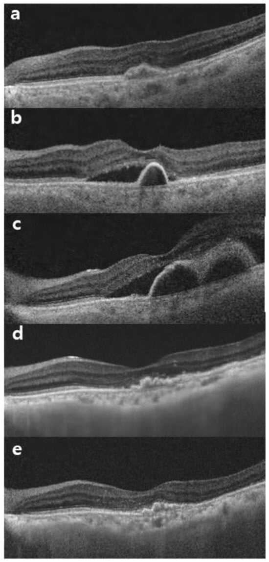 A representative case of a 73-year-old male patient with type 1 macular neovascularization in the left eye. (a) He has already received eight intravitreal aflibercept injections and maintained treatments. (b) After that, new subretinal fluid (SRF) with pigment epithelial detachment (PED) appeared. He received monthly aflibercept injections. (c) Despite three monthly aflibercept injections, SRF with multiple PEDs increased. (d) He started receiving brolucizumab injections. After switching, the SRF and PED were resolved completely. (e) Six months after the switch to brolucizumab, no more fluid was observed.