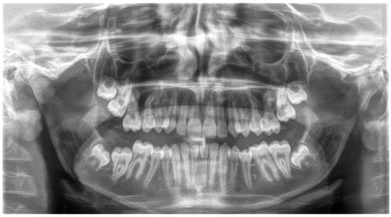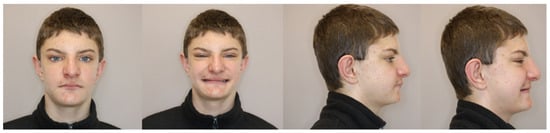 In an extraoral test, clinical examination revealed short stature [1,2,7] and dysmorphic facial features, such as a characteristic large bulbous nose [4], narrow eyelid gaps, a broad nasal septum, and chin protrusion. Their philtrum is short [3,10] and their mouth is wide with a lineal orientation and a thin vermilion border of the upper lip [12,14]. Moreover, an infantile method of swallowing was confirmed. The patient’s appearance is shown on extraoral photographs (Figure 1).