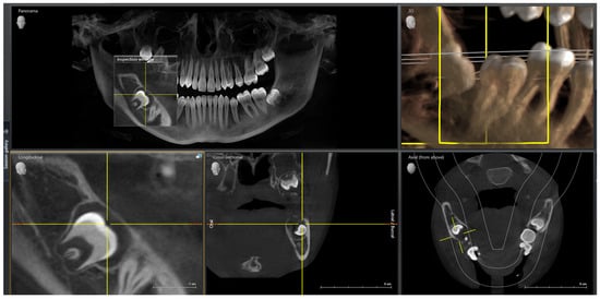 During consultation the treatment plan was presented, which included the installation of fixed braces in the upper arch and lower lingual to verticalize the lower molars, prevent tipping [18], and strengthen the anchorage when bringing tooth 47. It was advised that brackets with high torque be placed in the upper arch, and brackets with a low torque in the lower arch to reduce deflection. At the bottom, intrusion of the incisors might be necessary. Additionally, the extraction of tooth 48 was planned because of the follicular cyst that is visible on the CBCT scan (Figure 6).