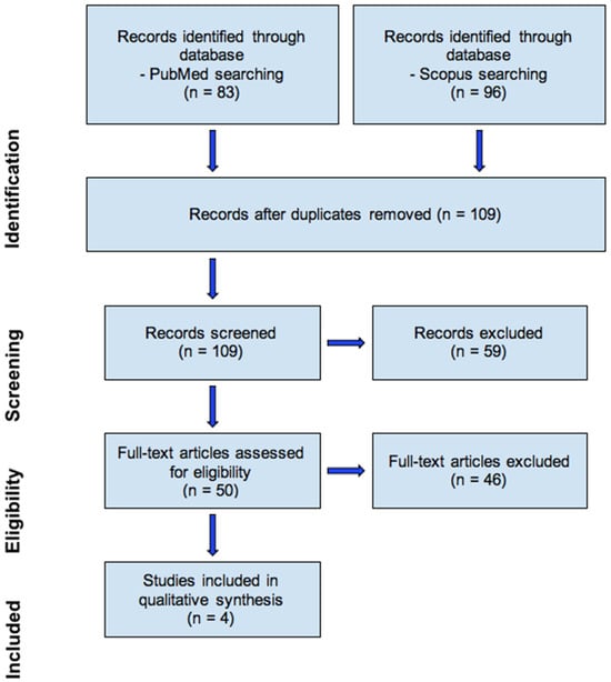 The electronic databases PubMed and Scopus were searched from 2003 to 2023. The language of the articles was restricted to English. The following keyword was used for the search: Floating–Harbor syndrome. In total, 83 articles from PubMed and 96 articles from Scopus were initially included in this study. After removing duplicated papers, 109 articles were chosen. Among them, case report formats were distinguished (50) as an inclusion criterion, 4 of which contained information about dental abnormalities and did not involve animal studies. Exclusion criteria were articles that were not case reports, not about dental abnormalities, and those that were animal studies. The results are shown in the PRISMA flow diagram (Figure 7).