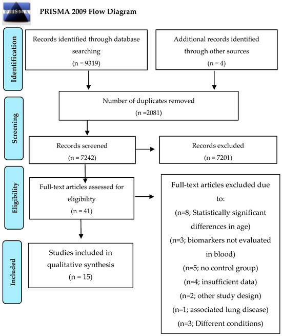 In all, 9323 records were identified during the search. After the removal of duplicate records, 7242 articles were maintained. Forty-one (41) were retained after the reading of titles and abstracts. Twenty-six (26) of these were excluded due to lacking eligibility criteria: eight studies were excluded as a result of statistically significant differences in age between COPD patients and controls [21,22,23,24,25,26,27,28,29]; three were excluded due to the investigation of biomarkers in lung or muscular tissue [30,31,32]; five studies had no control group [17,33,34,35,36]; three did not report the results of statistical testing for discrepancies in age between COPD patients and controls [37,38,39]; and one did not perform comparisons [40]. Two articles employed a study design that was inconsistent with the stated eligibility criteria [41,42]. One article was excluded due to the presence of an associated lung disease [43], and three others were not considered due to insufficient data according to the scope of the present SR [44,45,46]. Following the application of exclusion criteria, a total of 15 studies were included (Figure 1).