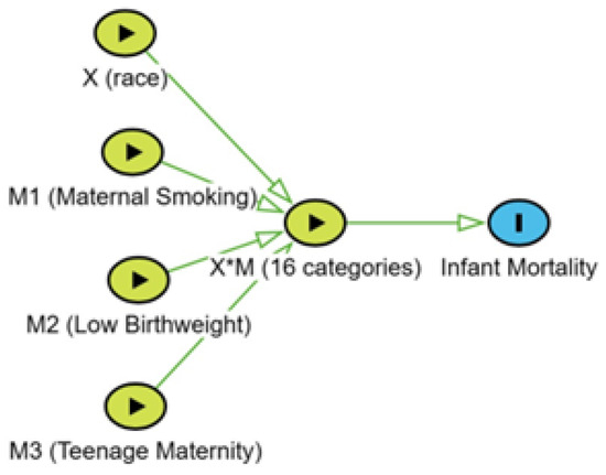 The strengths of the study include both flexible model specification and direct estimation of potential outcome probabilities. In mediation modeling, it is now common practice to include interactions among the cause of interest and potential mediators [7,12]. However, causal diagrams to model effect modification have been inadequate [17,18]. Weinberg proposed representing the effect modification by crossing arrows (Figure 1 in Weinberg) [17]. Attia et al. proposed two further modifications [18]. The first was to add a node at the point of crossing arrows, and the second was to link additional causes as also having an arrow to both the interaction node and the outcome (Figures 2b and c in Attia et al.) [18]. The current study could have extended the Attia et al. DAG to have four binary nodes (X, M1, M2, and M3), with each node having one arrow to infant mortality and a second arrow to an eight-level interaction node. The current study’s DAG (Figure 1) is computationally equivalent but has the advantage of exploiting the extraordinary simplicity of estimating the full set of 16 potential outcomes using Bayesian estimation. The graphical model specifies potential confounding among all binary variables (X, M1, M2, and M3) because of a common downstream variable (the interaction X*M). The causal effects of X, M1, M2, and M3 are on the interaction node. An important distinction of the model is that race is not causally responsible for the mediators of racial disparity. This is a highly desirable modification of models for investigating racial disparity.