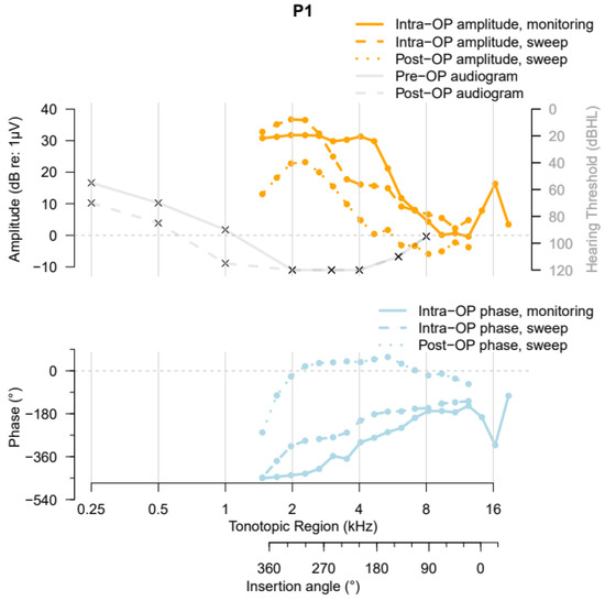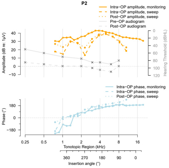 Participant 1 (P1) had a typical high-frequency preoperative hearing loss, visualized in Figure 1 (top, solid grey curve), with a pure tone average (PTA) of 83.75 dB HL. Postoperative imaging of Participant 1 revealed that the cochlear duct had a length of 36.2 mm and an AID of 374°. During insertion of the precurved HiFocus MidScala electrode array, a “Harris Type A” ECochG amplitude pattern (i.e., an overall increase in the first harmonic’s amplitude from the beginning of insertion until completion [13]) was measured. A large phase shift was visible in the very early stage of insertion in the basal region of the cochlea. After full insertion and securing of the electrode array, the intraoperative electrode sweep recording showed a peak in the apical region. The highest amplitude was recorded close to the 2 kHz tonotopic region, and the recordings showed a gradual phase delay along the BM. The postoperative ECochG measurement showed a pattern similar to the intraoperative sweep recording, with a slightly larger phase change in the apical region. The HP after cochlear implantation was 57.1%.