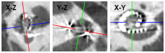 Example of a CT scan of a cochlea with an inserted MidScala electrode array (P1). The red lines in the x-z and y-z planes are aligned with the cochlea’s basal turn so that the x-y plane is aligned with the cochlea. One or more slices in the x-y plane, showing the CI electrodes’ contacts, can then be exported for analysis.