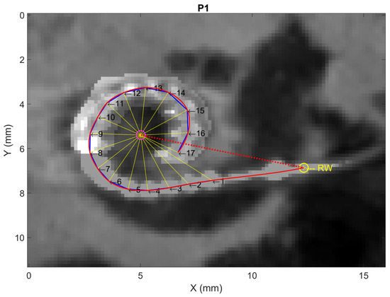Visualization of the method used to extract the individualized insertion angles and tonotopic regions for each recording location of the ECochG electrode sweep of participant P1. The pink and yellow circles, respectively, show the cochlear center and round window (RW), while the arrows, denoted by numbers 1 to 17, show the various points along the electrode array selected by the user. The solid blue lines show the linear connections between the selected points, while the solid red line shows the trajectory of the electrode array estimated using spline interpolation. The dashed red line connects the RW and cochlear center, and the thin yellow lines connect the selected points along the array with the cochlear center.
