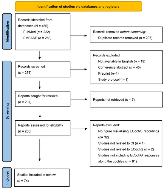 In total, 480 records were identified from the different databases (Figure 4). After removing 207 duplicates, another 65 records were eliminated during screening for the following reasons: not available in English (n = 19), conference abstract (n = 45), preprint (n = 1), and study protocol (n = 1). Seven reports could not be retrieved, and the remaining 200 reports were assessed for eligibility. Another 125 reports were excluded for various reasons: 32 reports did not include any figure visualizing ECochG recordings, one study was not related to CIs, another two reports used the abbreviation ECoG for “electrocorticography” and were thus not related to ECochG, and finally, the majority of the excluded reports (n = 91) did not visualize the amplitude of the ECochG response along different locations in the cochlea. Instead, they showed the growth functions of the amplitude of ECochG, ECochG responses recorded from a single location before and after insertion, or ECochG thresholds for different stimuli, amongst others. The remaining 74 studies [9,10,11,12,13,15,17,18,19,20,21,24,25,34,35,37,39,40,41,42,48,58,59,60,61,62,63,64,65,66,67,68,69,70,71,72,73,74,75,76,77,78,79,80,81,82,83,84,85,86,87,88,89,90,91,92,93,94,95,96,97,98,99,100,101,102,103,104,105,106,107,108,109] were included for review and are described in detail in Table S1 in the Supplementary Materials (https://github.com/OtoBM).