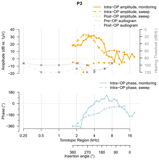 Participant 3 (P3) had little preoperative residual hearing (PTA = 97.5 dB HL) (solid grey curve, Figure 6), a cochlear duct with a length of 37.0 mm, and an AID of 362°. During insertion of the Contour Advance Electrode CI612, a “Harris Type A” ECochG amplitude pattern (i.e., an overall increase in the first harmonic’s amplitude from the beginning of insertion until completion [13]) was measured. The highest amplitude occurred at around the 4 kHz tonotopic region. The phase changes relative to the acoustic stimulus showed an increase in delay after passing the 8 kHz tonotopic region along the BM. The intraoperative electrode sweep recording showed a similar peak pattern, with a slightly more apical peak. Postoperatively, no ECochG recordings above 0 dB (relative to 1 µV) could be recorded. Therefore, the phase data were not visualized in the lower part of the graph. The HP after cochlear implantation was 11.3%, indicating minimal HP.
