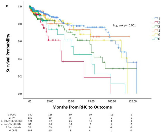 Survival of patients with chronic lung disease and pulmonary hypertension. Survival analysis of patients with chronic lung disease and pulmonary hypertension (A) and survival analysis stratified by underlying lung disease (B). The number of patients at risk is displayed at the bottom of the graph. In each graph, changes due to death before potential lung transplant are shown while those who received lung transplant are censored since they would no longer be at risk of death before transplantation. Lung transplantation is not reflected in the actual Kaplan–Meier survival curves. RHC: right-heart catheterization.