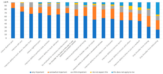 The most important objective for patients undergoing shoulder arthroplasty was to relieve daytime pain (‘very important’ for 84%, ‘somewhat important’ for 14%). The second most important was to improve self-care (‘very important’ for 74%, ‘somewhat important’ for 14%). The ability to be able to reach above shoulder level was third (‘very important’ for 68%, ‘somewhat important’ for 18%). A detailed evaluation of the SSES is provided in Figure 1.