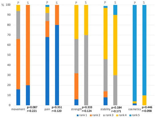Patients’ (P) and surgeons’ (S) ranking of the factors movement, pain, strength, stability and cosmetics being the most important to achieve after shoulder arthroplasty.