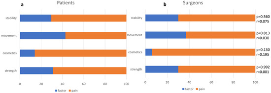 Patients’ (a) and surgeons’ (b) ratio of importance between pain and other outcome parameters.