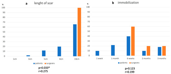 Patients’ acceptance for 100% shoulder function and surgeons’ anticipation. (a) length of scar, (b) immobilization, (c) physiotherapy, (d) pain, (e) hospitalization, (f) aftercare. * p ≤ 0.05, ** p ≤ 0.01.