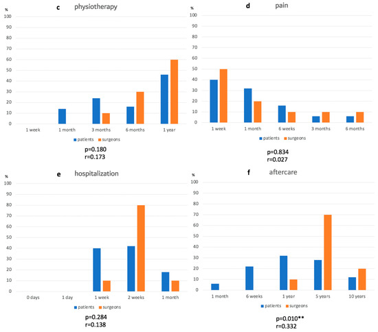 Nevertheless, surgeons significantly overestimated the postoperative aftercare patients would undertake (Figure 4f). While 70% of surgeons thought 5 years and 20% thought 10 years would be acceptable, 32% of patients preferred aftercare of 1 year, 28% of 5 years and 22% of 6 weeks. This might be explained by the fact that patients already had a long medical history, and one goal of the operation is to finally remove the need to visit a doctor. This underlines that aftercare and its status for the postoperative outcome should also clearly be discussed with the patient.