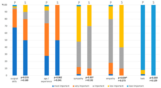 Opinion about the most important factor for choosing one‘s surgeon (P = patients, S = surgeons). * p < 0.05.