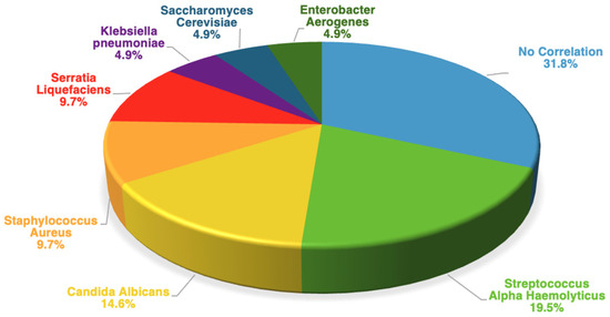 Among the predominant microorganisms identified in these samples, Streptococcus alpha-haemolyticus, Candida albicans, Staphylococcus aureus, Serratia liquefaciens, Klebsiella pneumoniae, Enterobacter aerogenes, and Saccharomyces cerevisiae were the most prevalent. Notably, Streptococcus alpha-haemolyticus and Candida albicans were the most frequently detected, accounting for 19.5% and 14.6% of the samples, respectively.