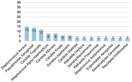 In the 41 samples of VP brushings, a total of 15 different microorganisms were isolated. In all VP brushing samples, the isolated flora was heterogeneous and showed co-colonization by different microorganisms. The isolated microorganisms were Staphylococcus aureus in 36.6% of the samples (15/41), Pseudomonas aeruginosa in 34.1% (14/41), Candida tropicalis in 29.3% (12/41), Streptococcus alpha-haemolyticus in 19.5% (8/41), Candida albicans in 19.5% (8/41), Candida krusei in 14.6% (6/41), Serratia liquefaciens in 14.6% (6/41), Candida glabrata in 7.3% (3/41), Klebsiella oxytoca in 7.3% (3/41), Serratia marscencens in 7.3% (3/41), Klebsiella pneumoniae in 7.3% (3/41), Streptococcus acidominimus in 7.3% (3/41), Enterobacter aerogenes in 7.3% (3/41), Saccaromyces cerevisiae in 7.3% (3/41), and Raoultella ornithiolytica in 7.3% (3/41) (Figure 3).