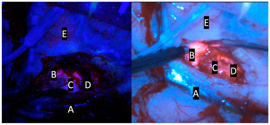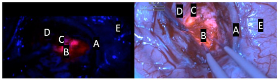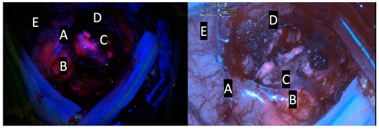 Comparative intraoperative pictures of patient N.9; kinevoi900 (left side); Olympus ORBEYE exoscope (right side). A: vascular structure; B: intense red area (lava-like); C: faint pink or pinkish area; D: blue area; E: cortical surface.