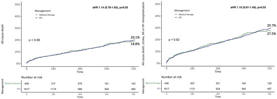 Two-year Kaplan–Meier survival curves for all-cause death and the composite of all-cause death, stroke, myocardial infarction (MI), and rehospitalization for heart failure (HF) according to the treatment received. aHR, adjusted hazard ratio; PCI, percutaneous coronary intervention.
