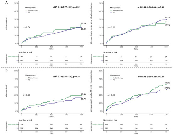 Two-year Kaplan–Meier survival curves for all-cause death and the composite of all-cause death, stroke, myocardial infarction (MI), and rehospitalization for heart failure (HF) according to the treatment received in different subgroups. (A) Proximal segment coronary artery disease (CAD). (B) Multivessel CAD. aHR, adjusted hazard ratio; PCI, percutaneous coronary intervention.