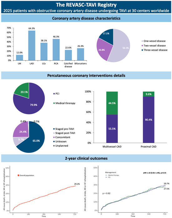 The aim of this analysis from the international, multicenter REVASC-TAVI registry was to provide an updated overview of characteristics and outcomes of TAVI patients with obstructive CAD in the current clinical practice, delving into CAD peculiarities and the management of this population. The main findings were as follows: