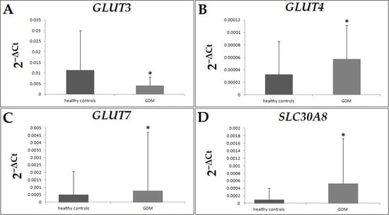 Importantly, the literature offers conflicting results regarding the expression of glucose transporters in patients with GDM. These discrepancies may result from different populations, the percentage of patients treated with insulin and technical differences (e.g., the selection of reference genes).