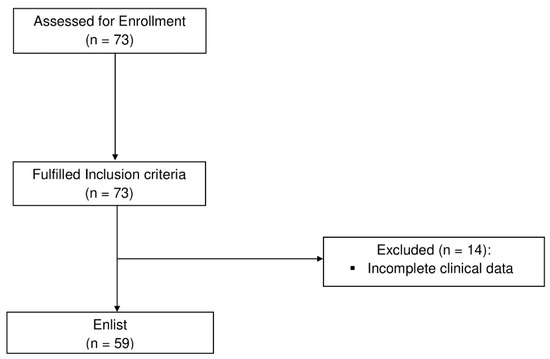 After screening 73 clinical records, 14 clinical records were excluded due to lack of data; finally, the data of a total sample size of 59 patients were recorded (see Figure 1).