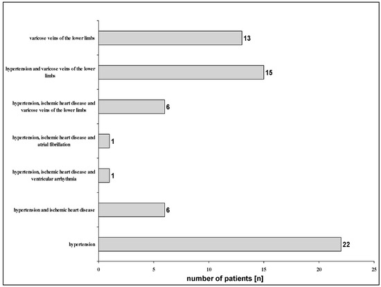 The study included a group of 100 patients aged 43 to 85, with an average age of 76.3 (±7.5). It included 64 women and 36 men. The basic demographic parameters of the study group are given in Table 1. The study group was very uniform in terms of indications for sanatorium rehabilitation and was dominated by patients with SOA and OA. (Figure 1). Only three patients had concurrent RA as a diagnosis, which indicated a medical recommendation for rehabilitation (Figure 1). When it comes to CVDs, patients with hypertension and ischemic heart disease (IHD) predominated; quite often, these two diseases occurred simultaneously (Figure 2). Varicose veins of the lower limbs were often found accompanying previous entities or occurring separately (Figure 2). Only one person reported paroxysmal atrial fibrillation (AF) in the interview. Similarly, ventricular arrhythmias occurred in only one patient. Arrhythmias have always occurred as abnormalities coexisting with hypertension and IHD (Figure 2). Therefore, in terms of CVDs, the group should also be considered homogeneous. This applies especially to cardiac arrhythmias, as the people included in the study, apart from the two cases mentioned, had no history of arrhythmias.
