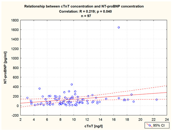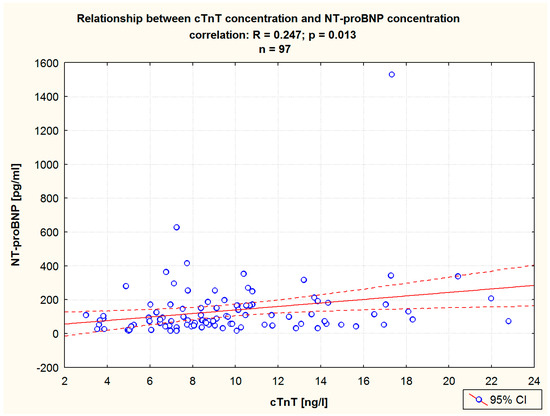 • Biochemical markers of the cardiovascular system regarding ischemia: cTnT concentration [ng/L] in whole blood was determined through electrochemiluminescence using the Elecsys 2010 analyzer from Roche (Roche Diagnostics GmbH, Mannheim, Germany). The cTnT cutoff point for this method according to the fourth universal definition of myocardial infarction is 14 ng/L (according to the definition, myocardial damage is defined as the detection of increased cTnT concentration in the blood above the upper limit of the reference range set at the 99th percentile in a healthy population) [19,20].