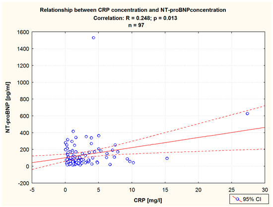 The Pearson correlation analysis between the NT-proBNP level before HSSB revealed that it statistically correlates with CRP (Table 6, Figure 7) and cTnT (Table 6). An analogous correlation analysis using the Pearson method performed after balneological treatment showed that TGC and cTnT were significantly correlated with NT-proBNP concentration (Table 6).