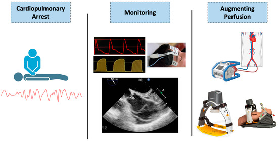 Despite representing the foundation of present-day CPR, chest compressions are inherently inefficient, providing less than 25% of normal cardiac output under the best circumstances [3]. As adequate myocardial oxygen delivery is a fundamental determinant of survival following cardiac arrest, several related physiologic targets have been established to optimize CPR quality [4,5,6]. Recent decades have seen important developments in CPR monitoring technologies aimed at enhancing resuscitation. Beyond end-tidal carbon dioxide (ETCO2) and invasive blood pressure monitoring, cerebral oximetry and transesophageal echocardiography (TEE) have been added to the armamentarium with emerging data [7,8]. A better understanding of CPR physiology has led to the development of several devices with the aim of modulating intrathoracic pressure, increasing cardiac output, and improving intra-arrest hemodynamics [9,10]. Extracorporeal cardiopulmonary resuscitation (eCPR) has gained considerable attention over the last several years with a potential role in select circumstances [11]. In this manuscript, we review the existing technologies and developments designed to monitor and augment hemodynamics during cardiac arrest resuscitation (Figure 1).