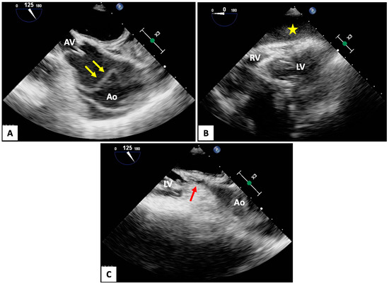 (A,B) Focused transesophageal echocardiography (TEE) images demonstrating a patient with a type A aortic dissection (yellow arrows) complicated by hemopericardium with tamponade (yellow star). (C) The area of maximal compression can be seen at the aortic root (red arrow). Ao, aorta; AV, aortic valve; LV, left ventricle; RV, right ventricle.