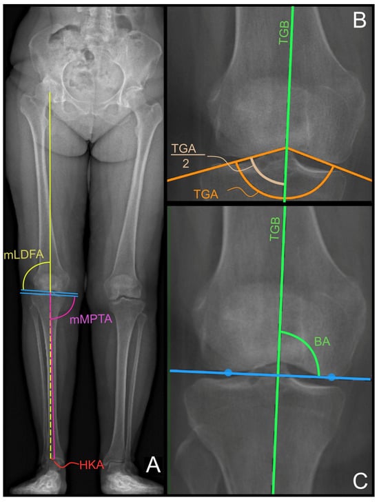 Three members of our orthopedic unit with different levels of experience assessed the inter-observer reliability of the collected images: one senior orthopedic surgeon (F.I.), one junior orthopedic surgeon (M.D.), and one orthopedic resident (A.I.). Moreover, the same senior surgeon evaluated the same radiographic images at three different time points, each spaced two weeks apart, to evaluate the intra-rater reliability. Each investigator assessed the following parameters, defined in []: the hip-knee-ankle (HKA) angle, which was expressed as a deviation from 180° with a negative value for varus and positive value for valgus alignment; the mechanical lateral distal femoral angle (mLDFA) and the mechanical medial proximal tibial angle (mMPTA), as depicted in Figure 1A.
