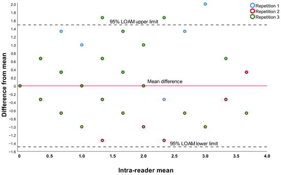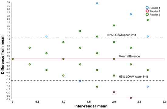 The statistical analysis was conducted using IBM SPSS version 25.0. Intra-rater and inter-rater reliability analyses were carried out utilizing the extended version of the Bland and Altman plot, and the intra-class correlation coefficient was calculated through two-way random effects, absolute agreement, and multiple measurements/raters. The extended Bland and Altman plot illustrates the difference from the mean against the mean of the raters (inter-raters) or the measurements (intra-raters) []. To assess the agreement of the continuous measurements among multiple observers, we employed the limits of agreement with the mean (LOAM) for multiple observers and multiple measurements per observer, as introduced by Jones et al. []. This method demonstrates how much an individual observer’s measurement can deviate from the mean measurement of all the observers. The inter-subject repeatability coefficient (RC) was determined based on the algorithm outlined by Bland and Altman in 1986 [].