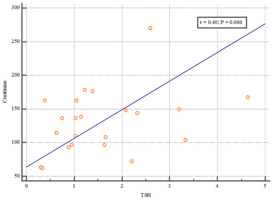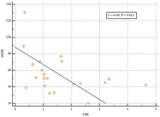 To examine the relationship between the initial TSH and the function of the graft throughout the follow-up period, the correlation between the initial TSH and the creatinine concentration, as well as eGFR after 6 and 12 months, was tested. A statistically significant correlation was found between the initial TSH and the eGFR value 6 months after transplantation (p = 0.023). The Spearman’s correlation coefficient was −0.493, which indicates a weak correlation between the two parameters (Figure 1).