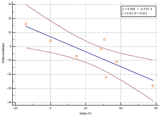 Scatter diagram (with regression line and 95% confidence interval) of delta creatinine (creatinine24months-creatinine0) and T4 (T424months-T0) 12 months after kidney transplantation. The scatter diagram shows how changes in total T4 levels affect changes in creatinine levels, an increase in total T4 levels leads to a decrease in creatinine levels.
