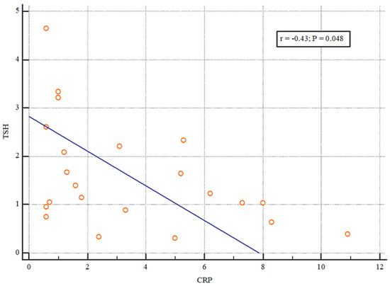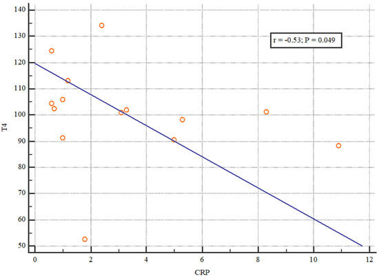 We evaluated the relationship between thyroid status and CRP as an inflammation parameter. Our analysis of initial CRP values and thyroid hormones revealed a weak negative correlation between TSH and CRP and a moderate negative correlation between T4 and CRP (Figure 4 and Figure 5).
